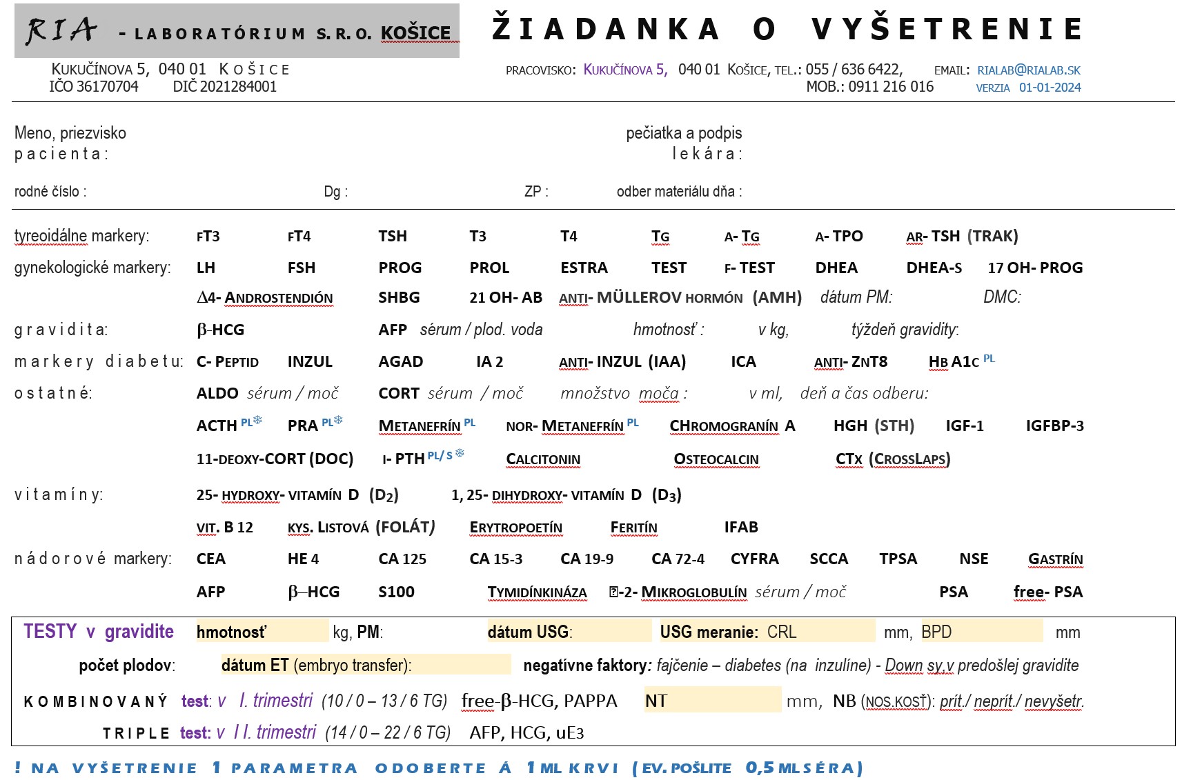 • v prípade záujmu o vyšetrenie, ktoré nie je uvedené na žiadanke, informujte sa telefonicky v laboratóriu o ev. možnosti jeho stanovenia